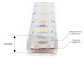 Taśma w całości zatopiona w masie z silikonu. Wykonanie to jest szczególnie odporne na penetrację przez wodę. Silikon charakteryzuje się dużym stopniem przezroczystości. Jest również odporny na działanie wysokiej temperatury, nie żółknie i nie twardnieje nawet po wielu latach i jest niepalny. Silikon zastosowany do produkcji jest odporny na działanie promieni UV. Montaż wersji IP68 odbywa się poprzez klejenie, produkt nie zawiera taśmy dwustronnej. Polecamy klejenie poprzez silikon neutralny.