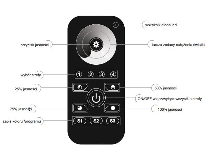 Pilot umożliwia sterowania od 1 do 4 niezależnych stref oświetlenia.