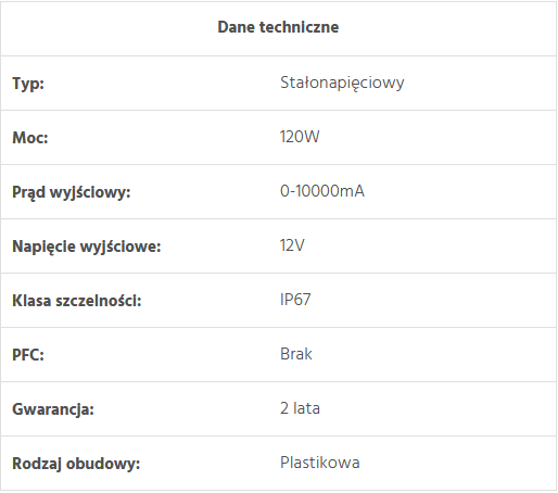 | Napięcie wyjściowe | 12V |